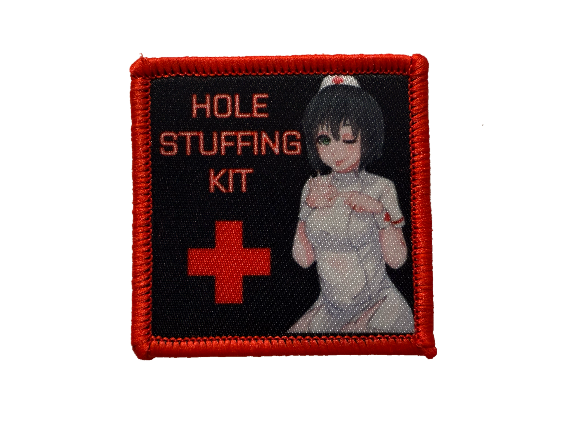 Sized 2x2 to fit on most commercial and issued trauma kits, the “hole stuffing kit” patch comes with a bright red border for visibility, and a cute nurse Katou to let your first responder know exactly what kind of degenerate they’re stuffing full of Quikclot.